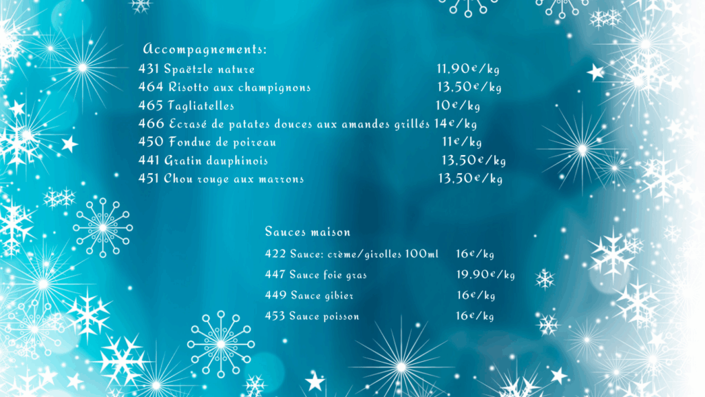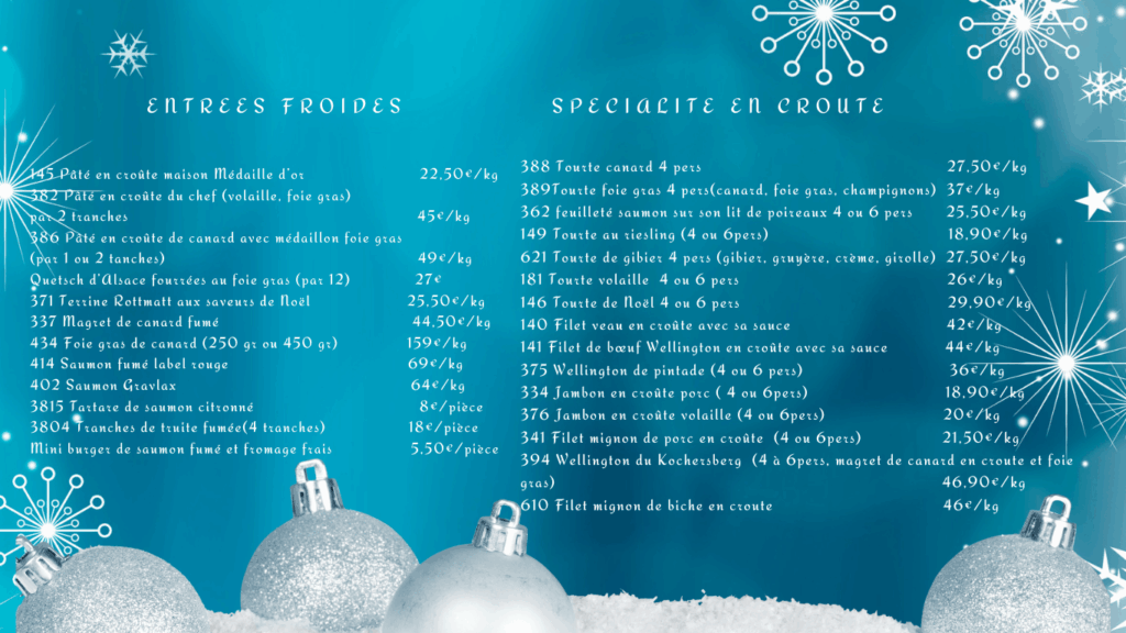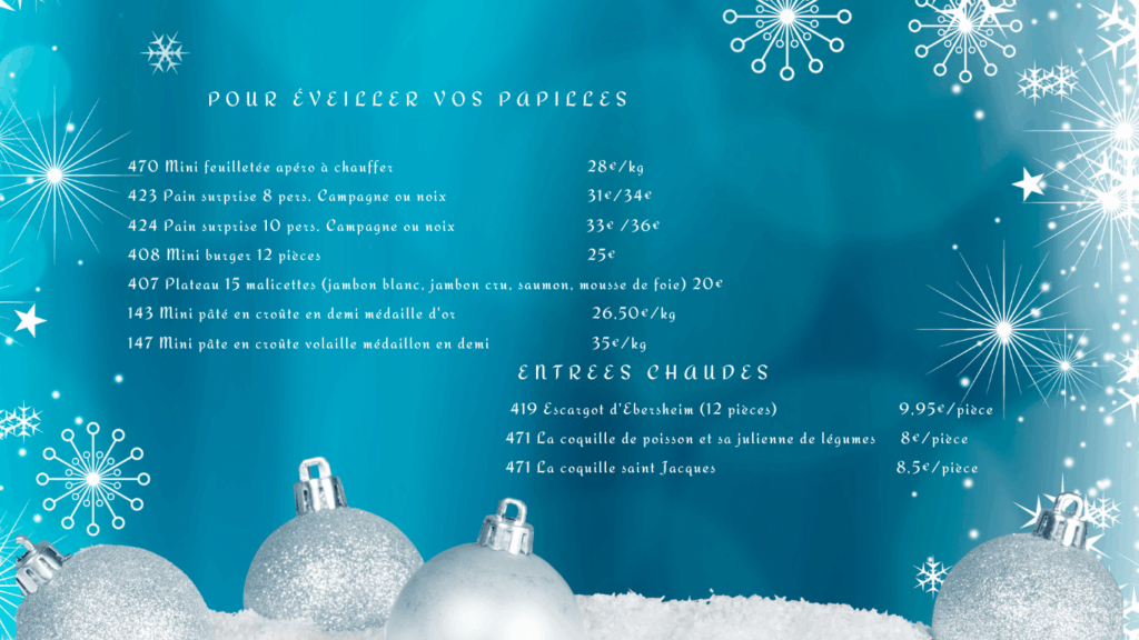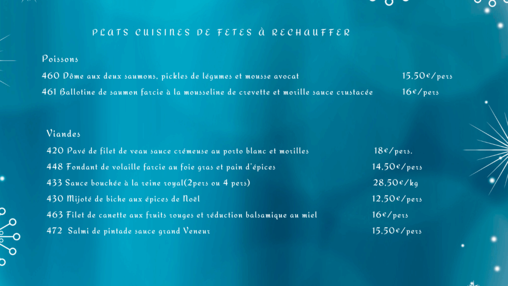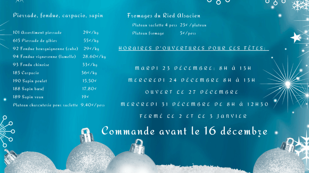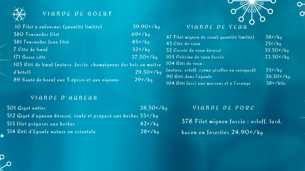 À travers les viandes, charcuteries et spécialités que vous choisissez pour vos repas de fête, c’est un peu de notre passion qui trouve place à votre table. Nous sommes honorés de contribuer à vos moments de partage, aux rires, aux conversations animées et à la magie qui accompagne chaque repas de Noël.